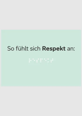 Karte in der Farbe petrol mit dem Begriff "Respekt" in [[sprache:Braille|fr]]-Schrift.